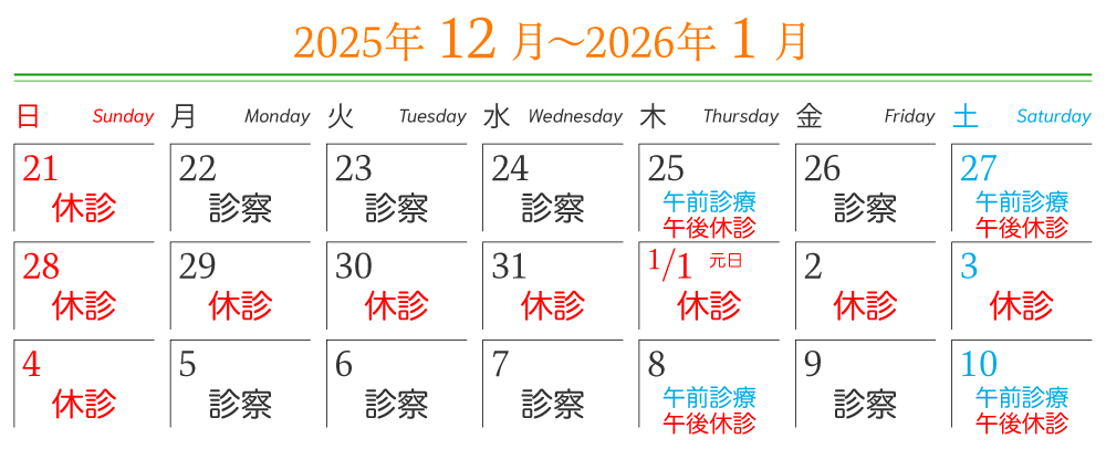 HOME お知らせ 年末年始休診のお知らせ 年末年始休診のお知らせ 2025年12月28日(日)から2026年1月4日(日)まで年末年始の休診とさせていただきます。1月5日(月)から通常診療いたします。ご不便をおかけいたしますが、よろしくお願いいたします。